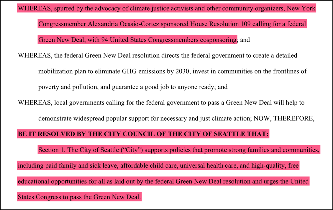 The Green New Deal is nothing more than the latest manifestation of a political con game as old as time. As was mentioned in a recent piece, the ultimate objective is a complete takeover of our economy and country by a political party that is desperate to reclaim power. Not to be deterred by their abysmal failure in DC, the radical progressives from 350.org packed up their show and brought it to their favorite PNW testing ground. Here they have been met with unanimous support from the Seattle City Council who instead of criticizing Representative Ocasio-Cortez, went so far as to credit her in the legislation.